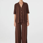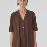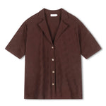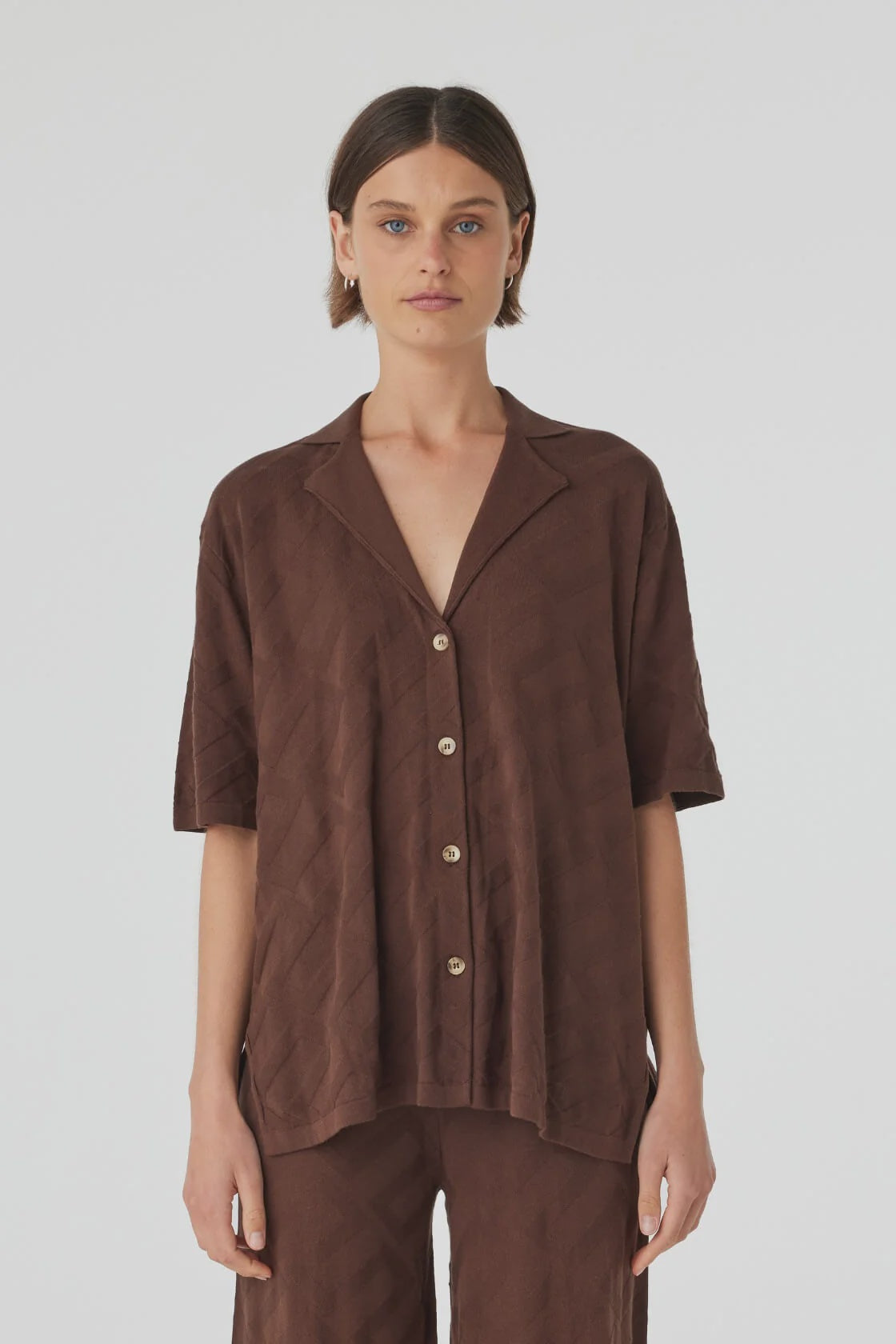 The Aria Shirt in Espresso is an oversized button-down knit, cut from 100% organic cotton for natural breathability. Its lightweight patterned texture, open collar, and side splits create ease of movement, while the relaxed silhouette makes it ideal for layering across seasons.