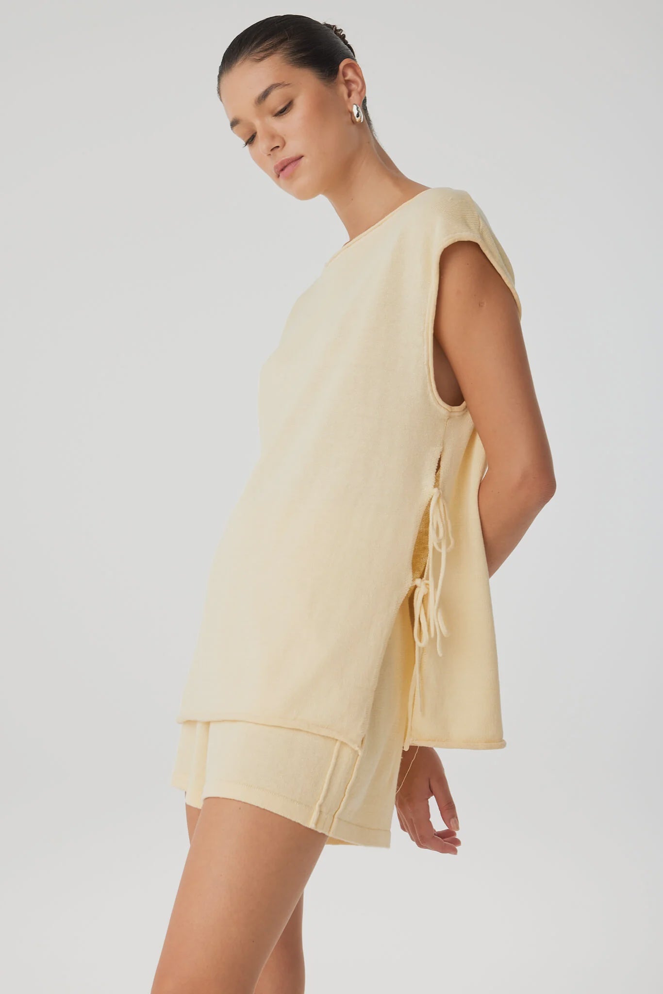 An oversized sleeveless top with subtle movement and softness. The Poppy features open side splits with adjustable ties, finished with rolled edges at the neckline and arms. Crafted in a breathable linen–cotton blend, it offers light texture and relaxed structure.