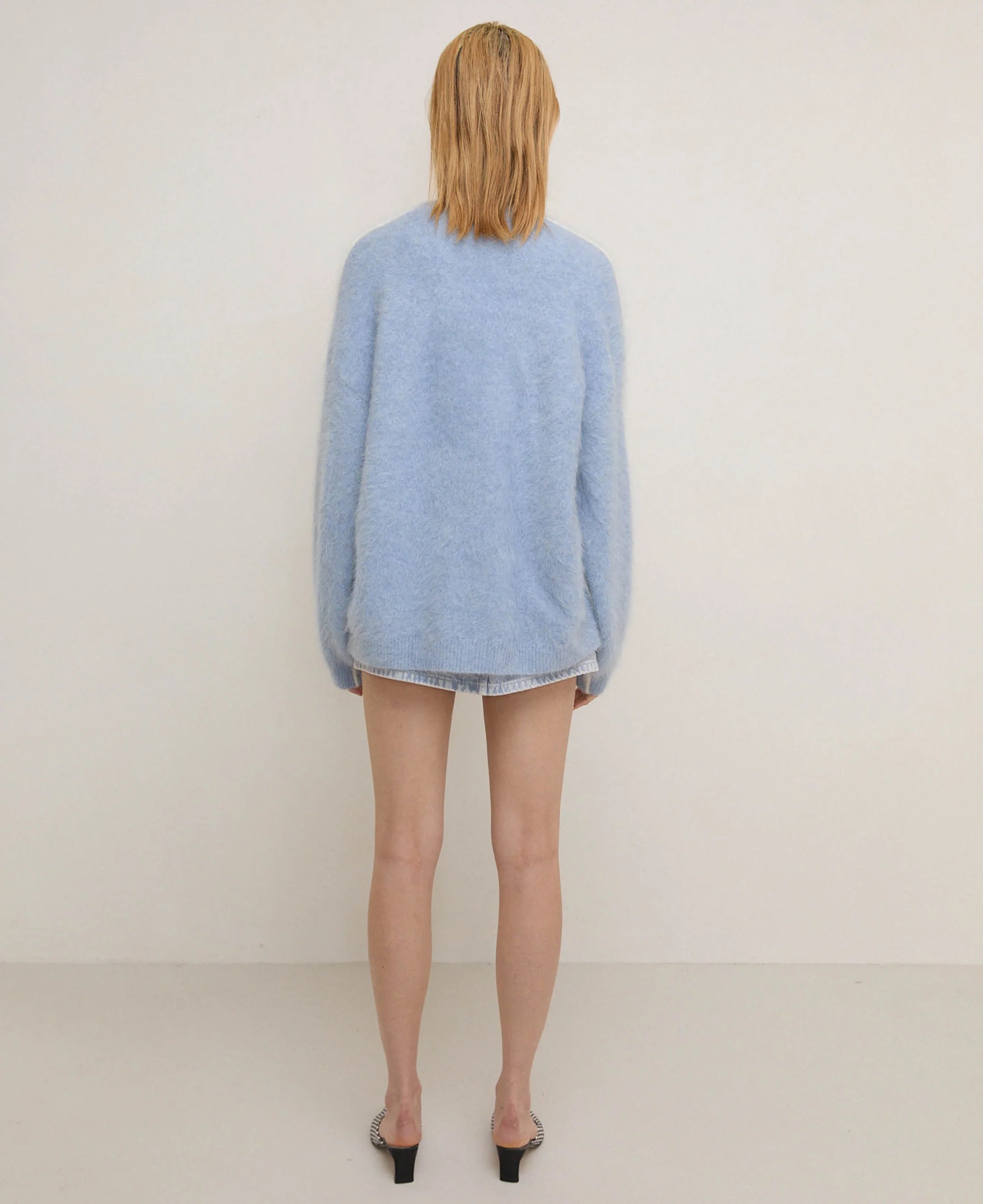 • Highly brushed fabric, fully-fashioned knitwear