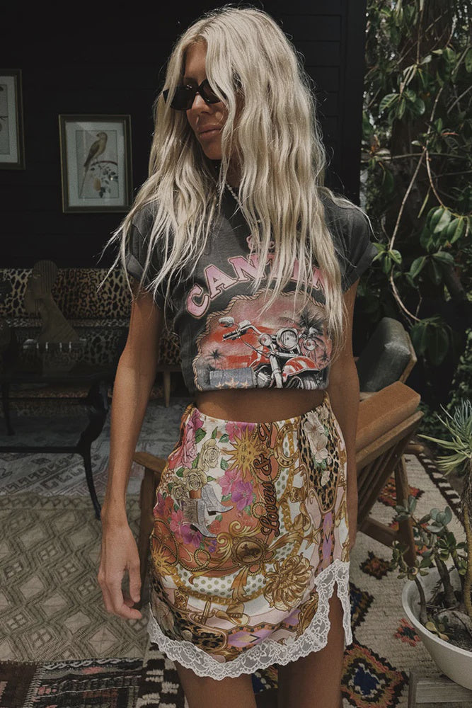 Every Lovers & Dreamers Lace Mini Skirt showcases a unique print placement, lovingly created to honour our commitment to minimising textile waste. This ensures your skirt is completely unique—just like you!