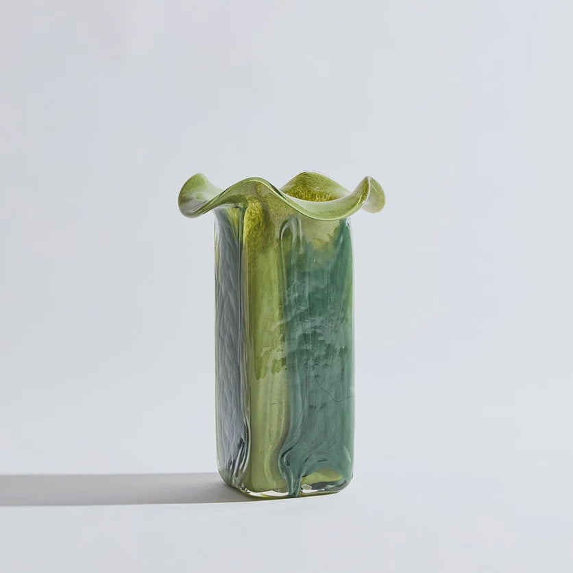 Inspired by the fluid lines of modernist sculpture, the Cubism vase is a bold expression of form and movement. Handcrafted from high-quality glass, each piece features soft, painterly swirls of colour, Salmon or Green, framed by a dramatic, sculpted rim. A true statement vase that blends artistic flair with refined craftsmanship.