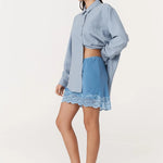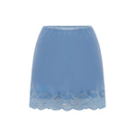A ROWIE icon, now in Cornflower. The Marina Mini is a bias-cut silk slip skirt with a lace hem, high waist, and fluid drape, grounded by an elastic waistband.