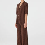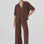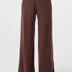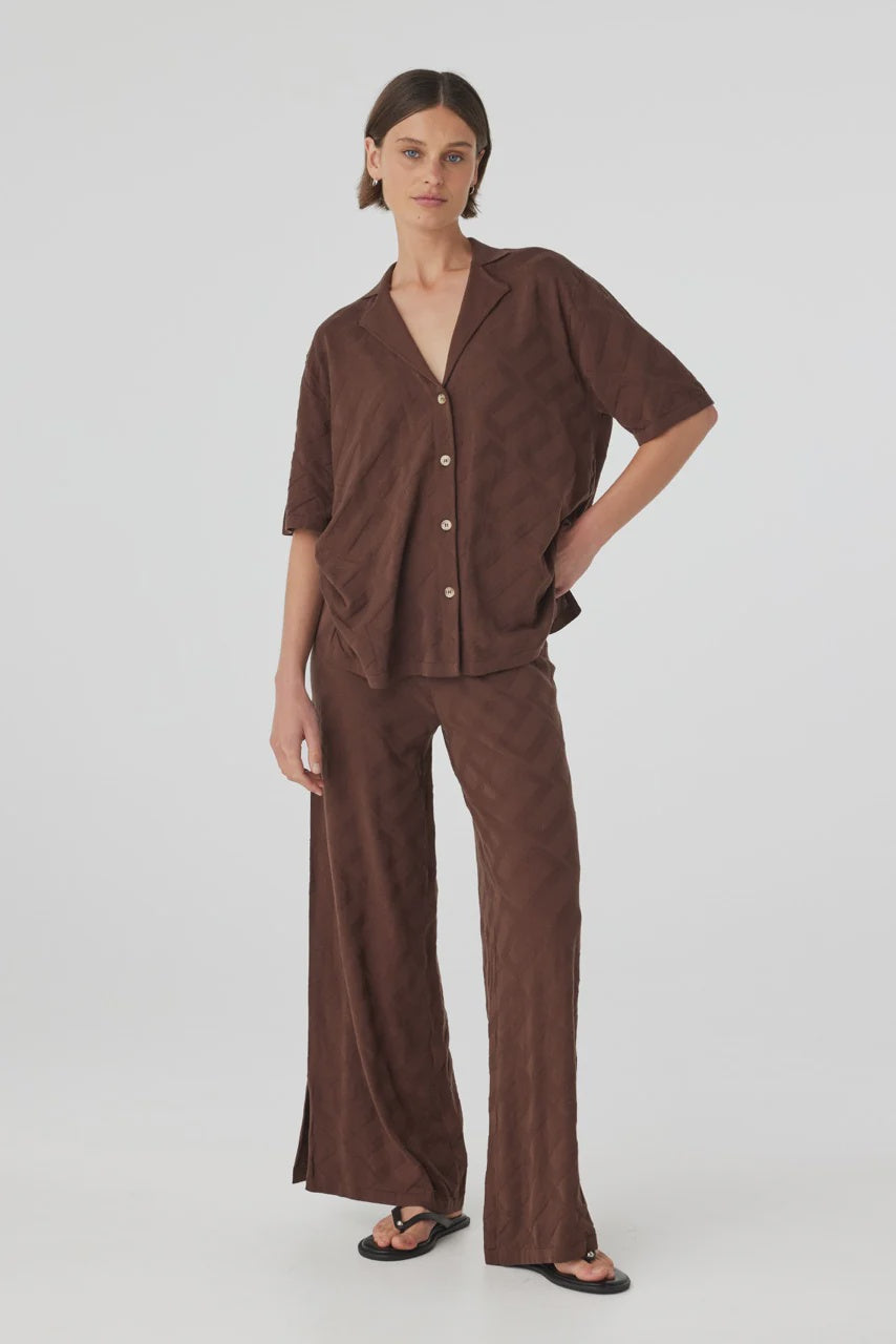 The Aria Pant in Espresso is a relaxed wide-leg knit, cut from 100% organic cotton for natural breathability. Its lightweight patterned weave flows with movement, while the ribbed elastic waist and side splits add ease and versatility. Designed for warm-weather layering and effortless transitions.