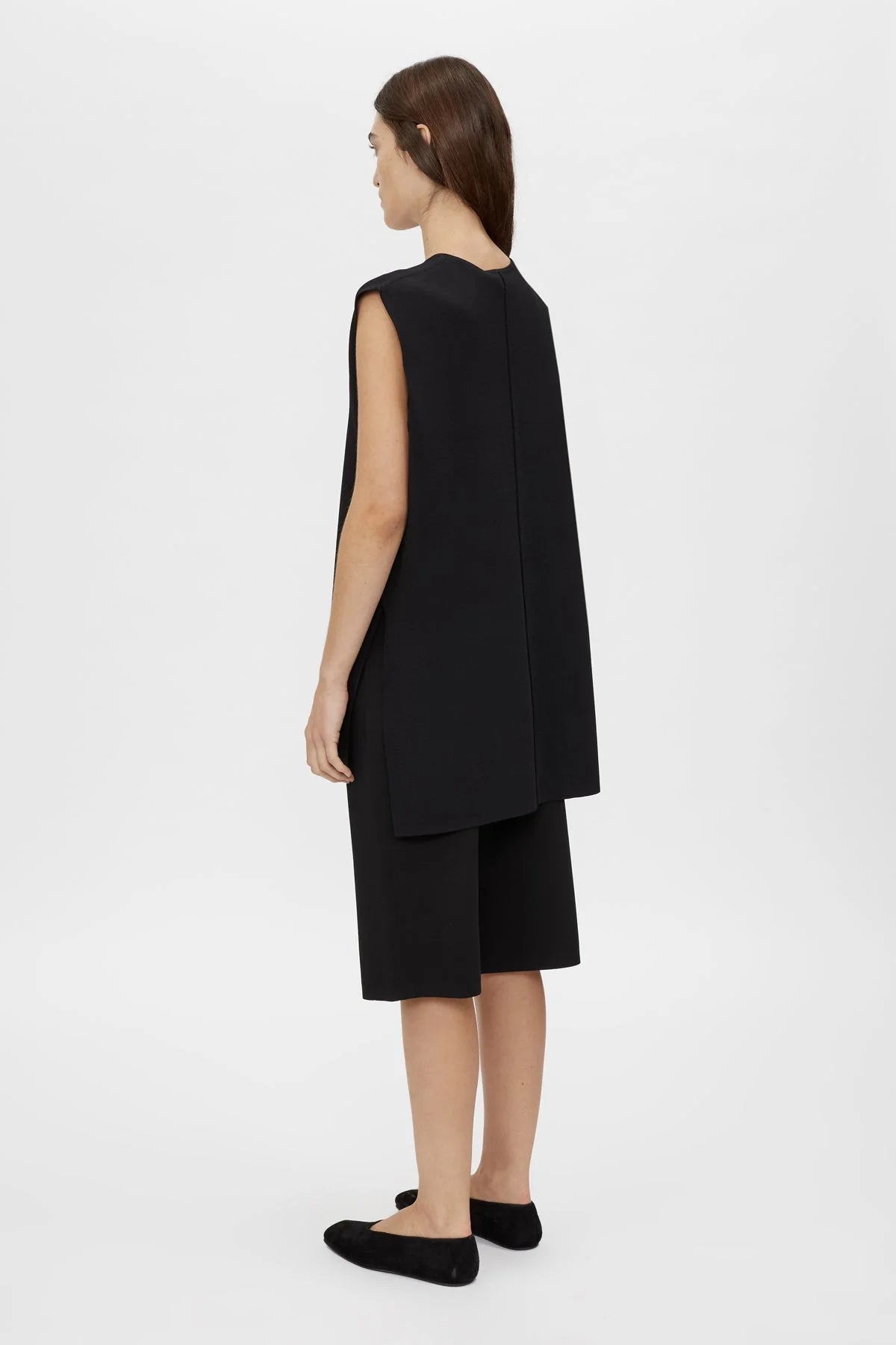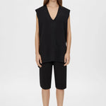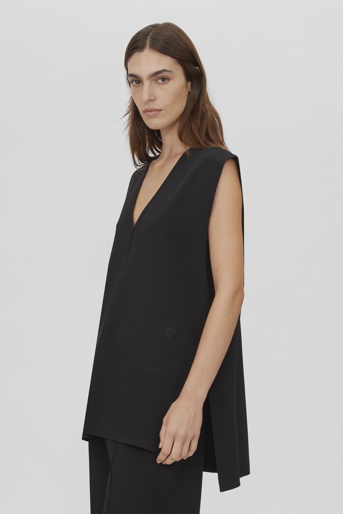 Donatello oversized V-neck knit vest in black. Double faced knit with contrast internals. Embroidered monogram and side splits.