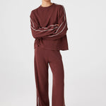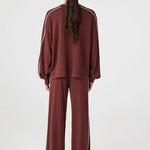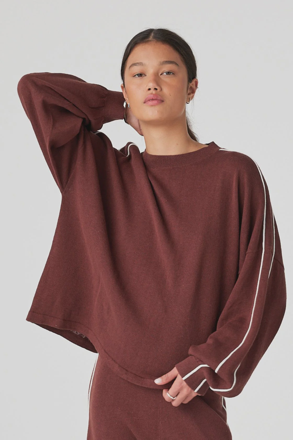 An oversized long sleeve tee in a linen–organic cotton knit that feels dry and breathable in warmth, with a relaxed drape that doesn’t cling. Drop shoulders and contrast stripe detailing create an easy shape for travel days, cool evenings and air-conditioned spaces.