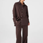 Oversized cotton shirt in a relaxed boyfriend cut, featuring an adjustable waist tie, oversized cuffs, and centre front button closure. Designed for layering or as a lightweight outer layer in warm to mild climates.