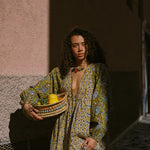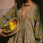Hand block printed in hues of olive, indigo, and clay, it’s an ode to slow mornings and late sun. Featuring a deep neckline, gathered waist, and full sleeves, this dress moves with intention.