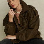 The Fontaine Leather Bomber Jacket is a timeless vintage-inspired piece crafted from 100% leather with a fully lined construction. Designed in an oversized fit, it features custom Spell leather patches, ribbed neckband and cuffs, and an elastic hemband for a refined silhouette. Long sleeves with subtle shoulder detailing complete the look. In rich vintage brown, this investment jacket transcends seasons, offering enduring style and versatility for years to come.
